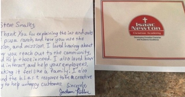 Steve Smalley from the Cedar Rapids, Iowa Pizza Ranch recently hosted a group of students from the Isaac Newton Christian Academy to teach them all about Pizza Ranch and our Mission and Vision. They were very intrigued about learning how a restaurant can positively impact people in the community. The group even scheduled a field trip to eat the buffet the very next day. Steve later received about 30 letters from the students thanking him for sharing with them.