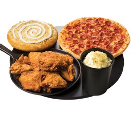 Medium Pizza, 8 Piece Chicken Box, Choice of Potato, and Small Cactus Bread OR Chocolate Chip Cookie
